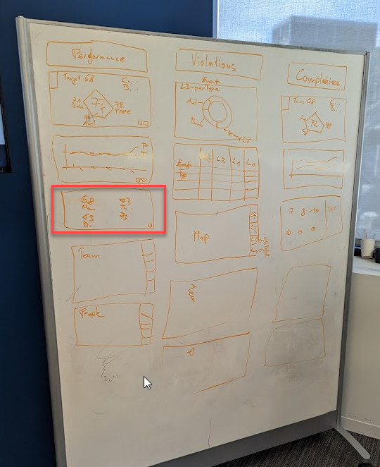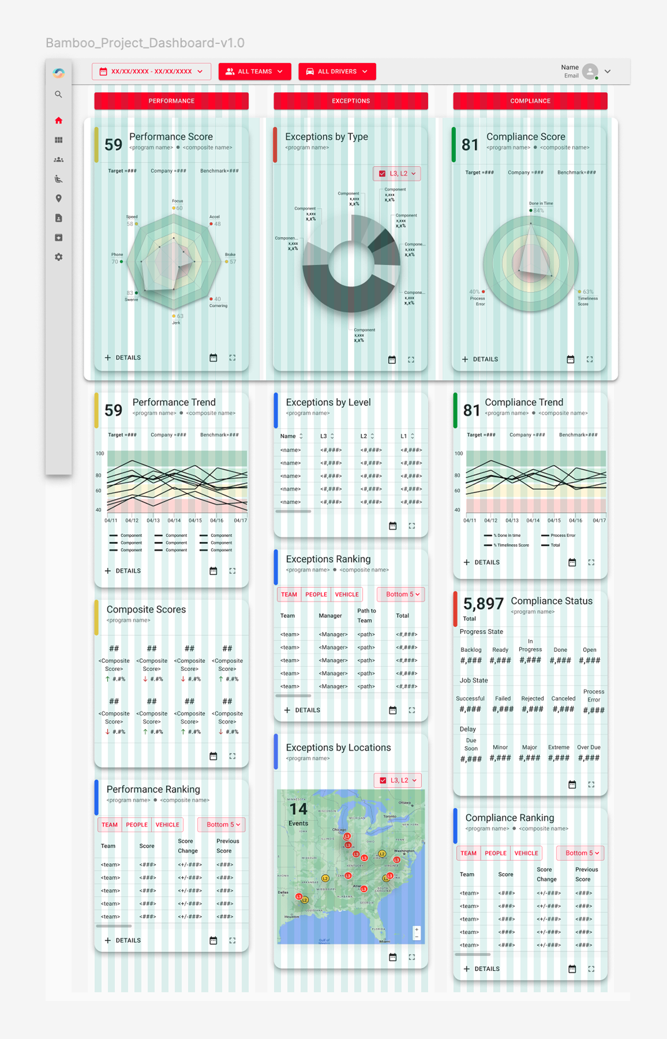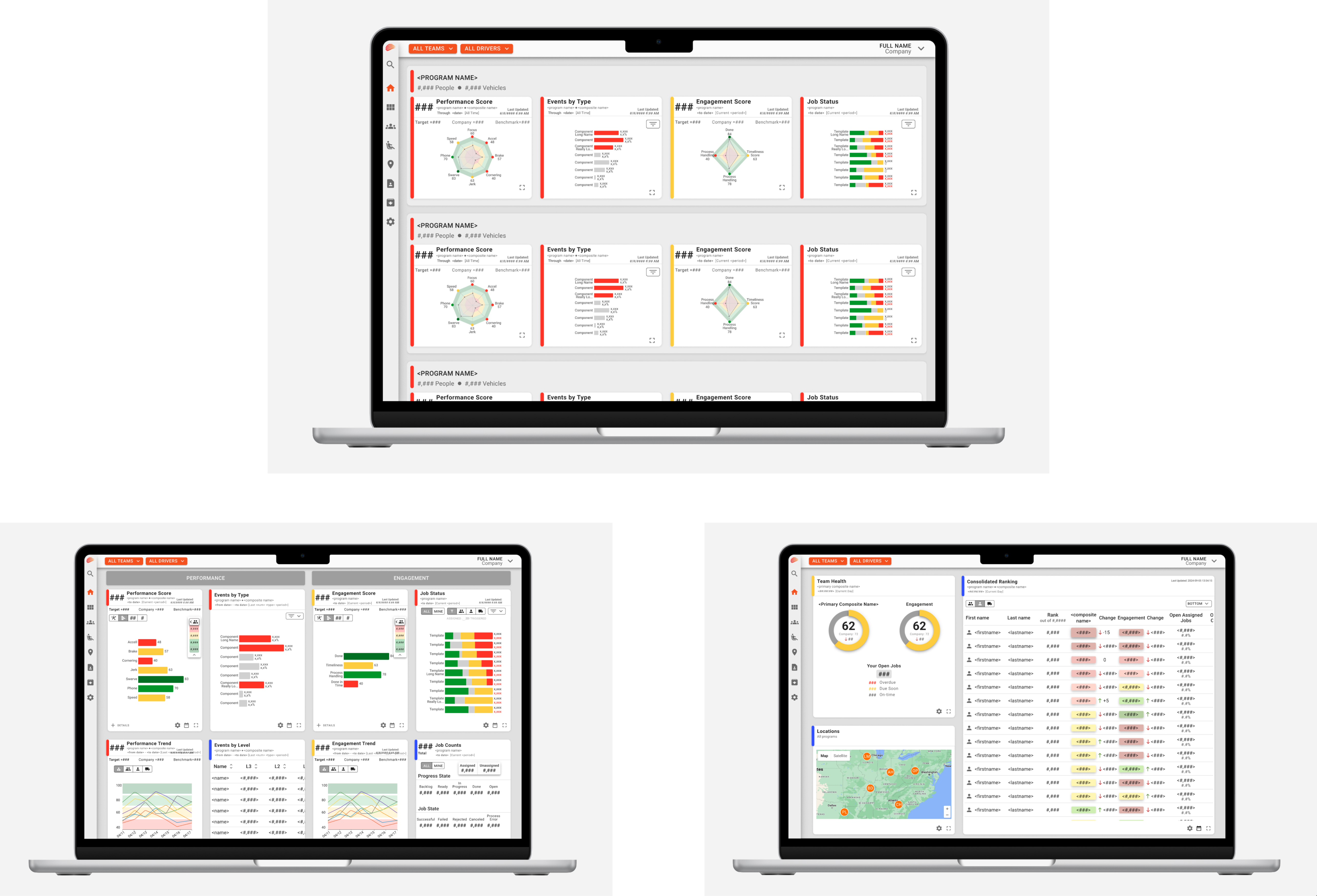The initial structure included three columns: Performance, Violations, and Compliance. Through iteration, this evolved into a four-column layout: Performance, Events, Engagement, and Jobs.
